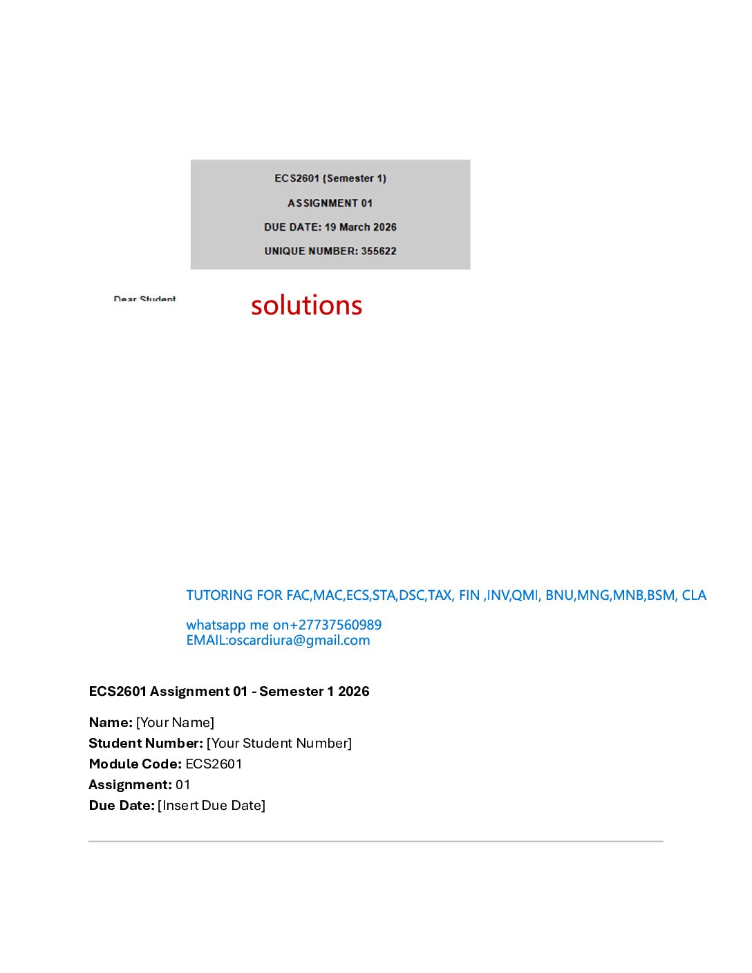 THIS DOCUMENT CONTAINS ECS1601 ASSESSMENT 5 (ALTERNATIVE TO ASSESSMENT 4) EXPECTED SOLUTIONS . USE THIS DOCUMENT AS A GUIDE